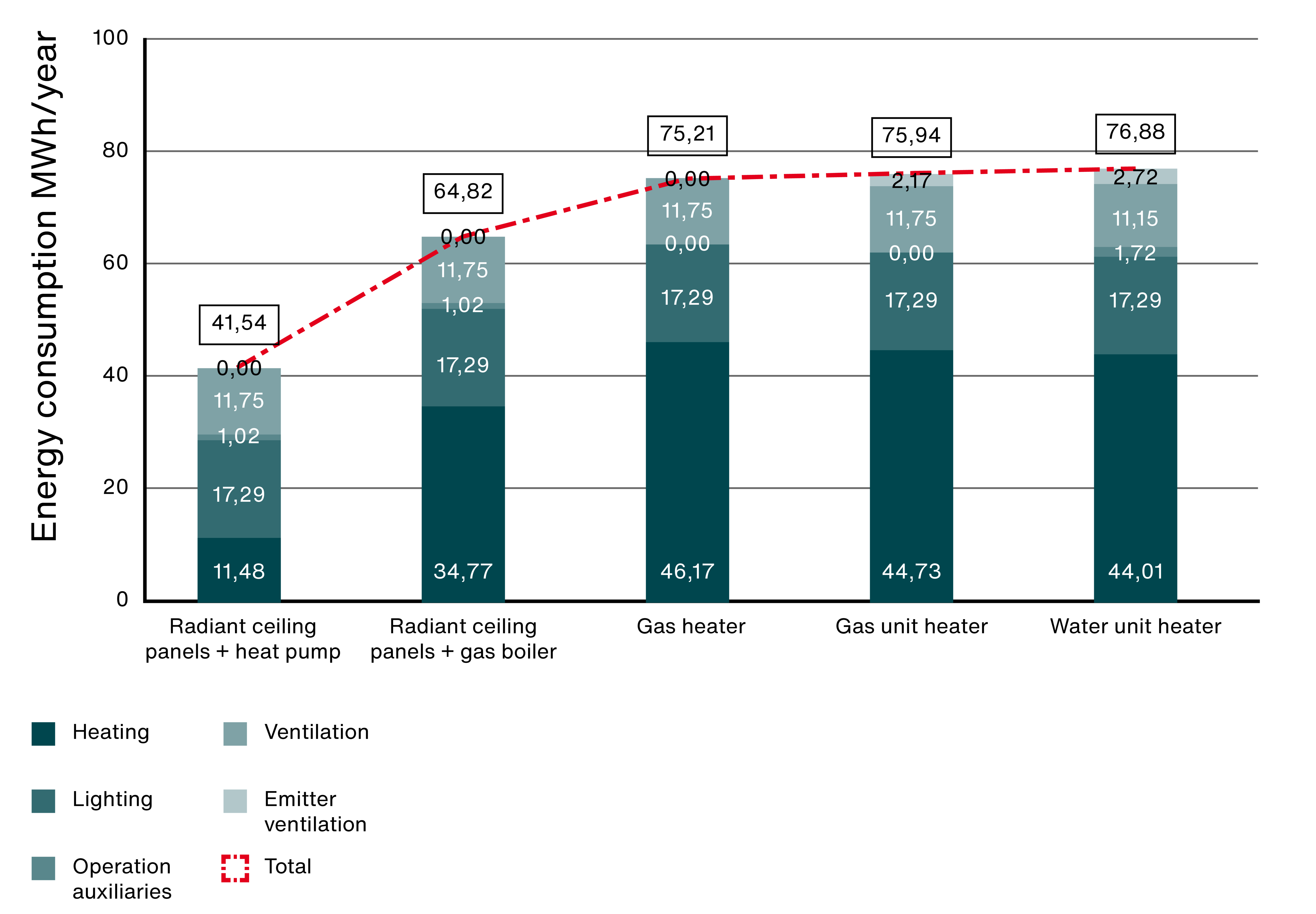 The most energy-efficient heating system combines radiant ceiling panels with heat pumps, reducing energy consumption by up to 45% compared to other systems. When gas is used as the energy source, radiant ceiling panels combined with a gas boiler offer the most effective solution. Compared to a hot water radiator, using radiant ceiling panels as heat emitters saves around 15% in energy.