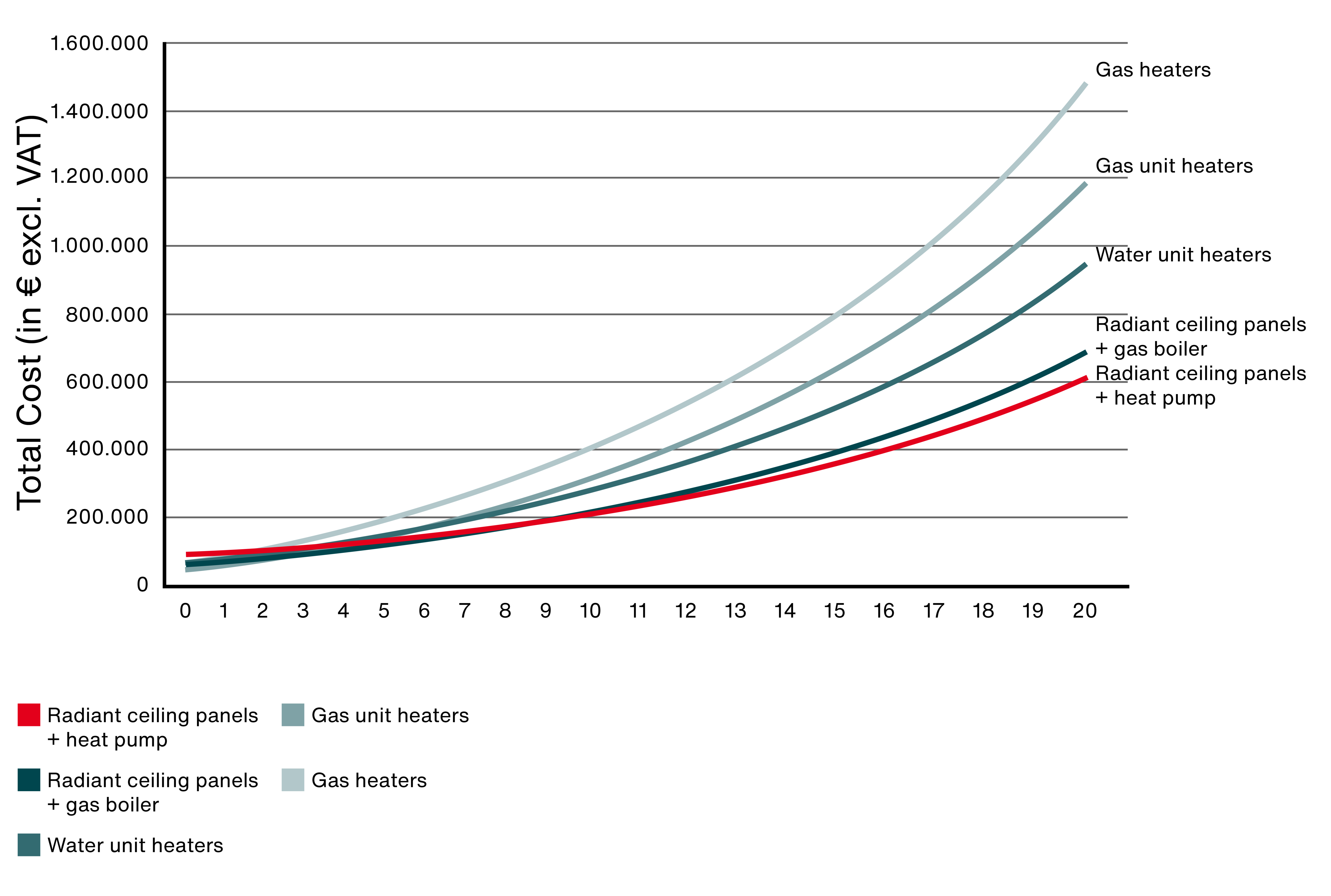 Radiant ceiling panels with heat pumps have the highest initial investment cost, while gas heating systems require the lowest. However, in just under three years, the lower running costs of radiant ceiling panels with heat pumps offset their higher upfront cost compared to gas heaters.