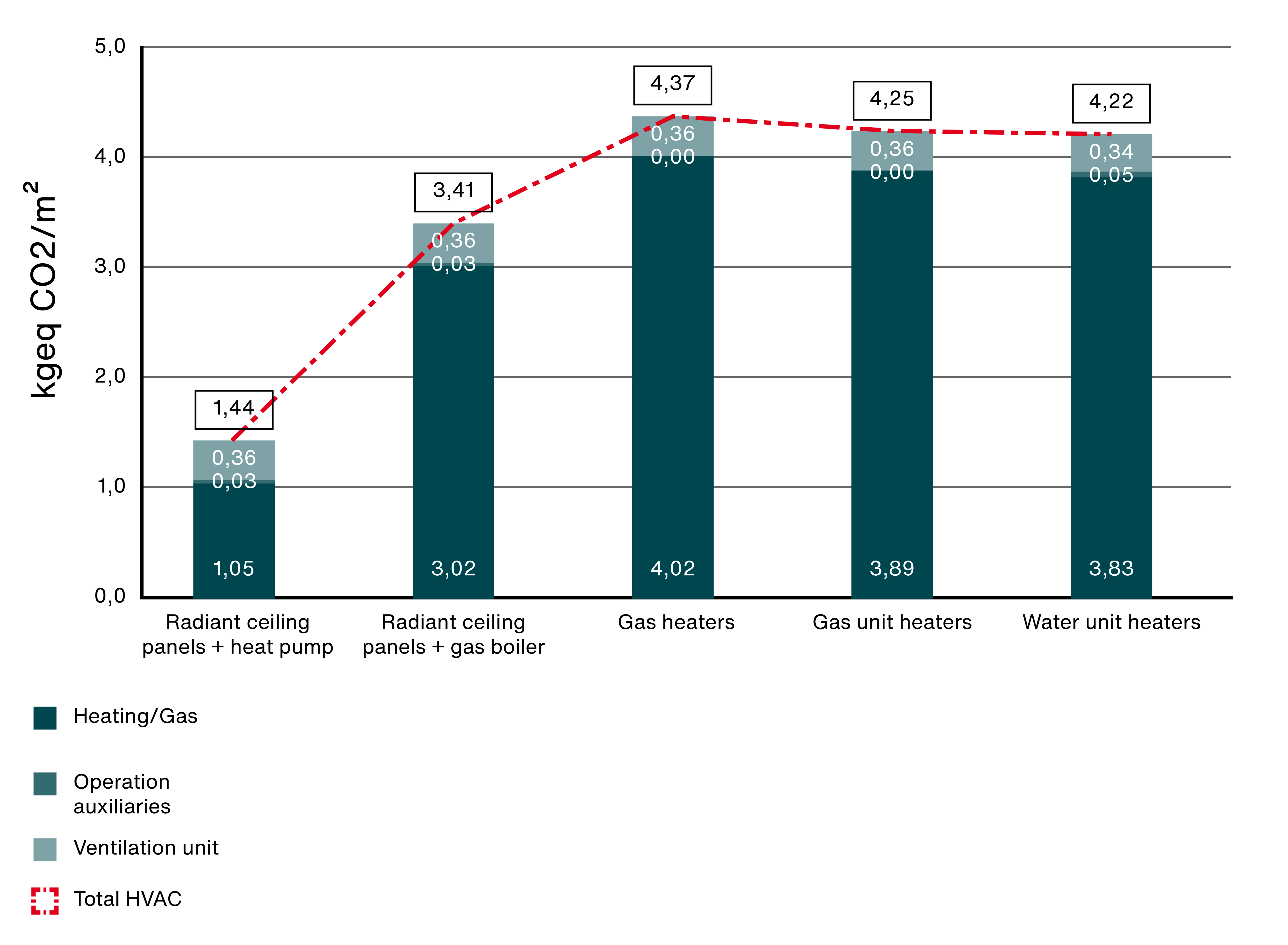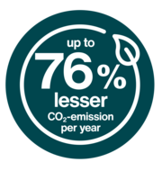The heating system with the lowest CO₂ emissions combines radiant ceiling panels with heat pumps. Compared to other systems, this setup can reduce CO₂ emissions by up to 67%. In second place are radiant ceiling panels with gas boilers, which still achieve savings of up to 22%.