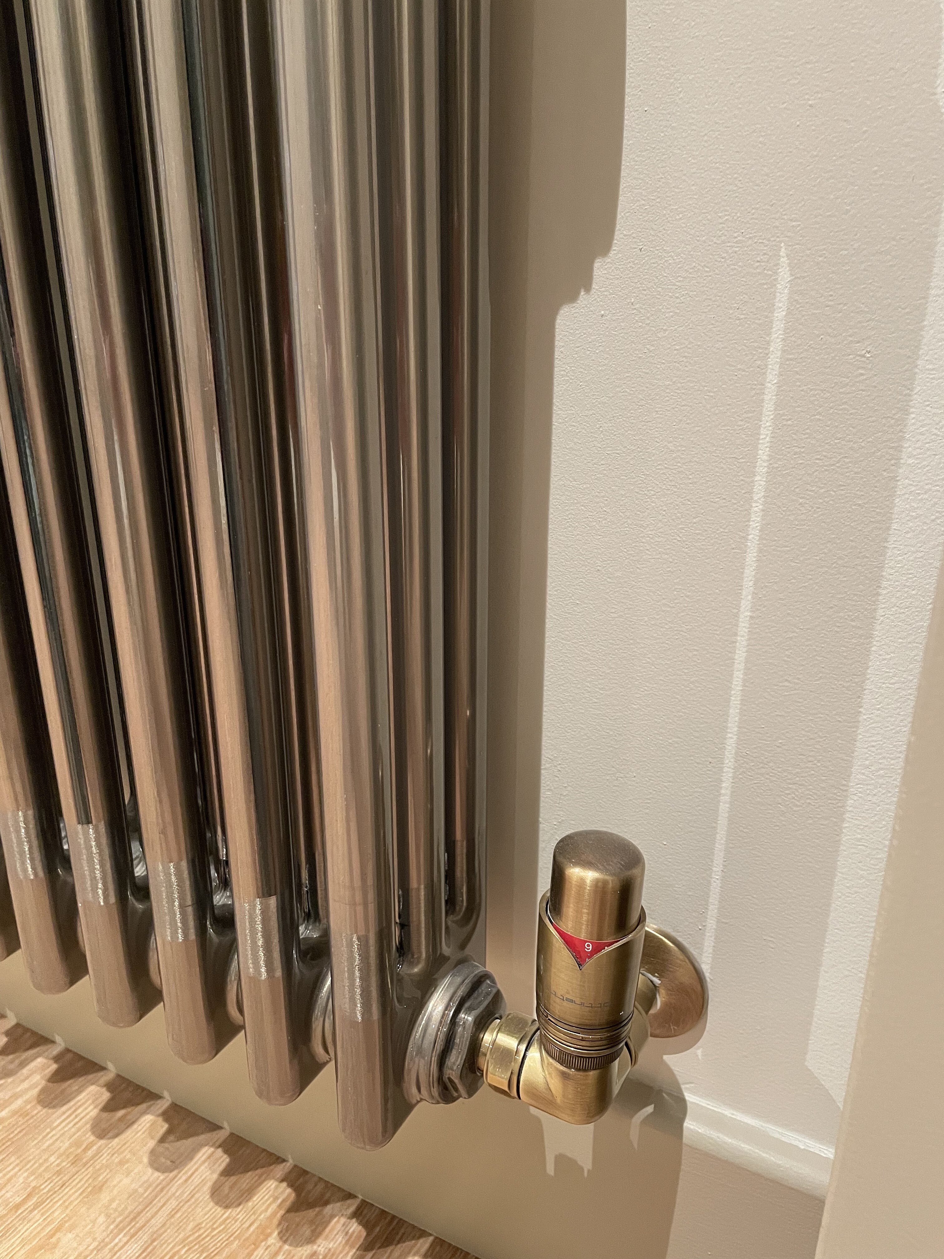 After viewing the radiators and valves, the client was most impressed with the overall build quality of the Zehnder Charleston, and the Technoline bare lacquered metal finish was selected. These were finished with brass double angled valves and brass pipe shrouds that were made on special order.